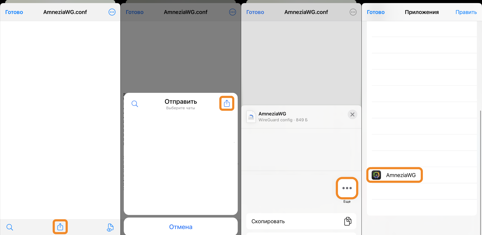 .confна устройство iOS. - Откройте полученный файл и нажмите иконку Поделиться, а затем ещё раз Поделиться.