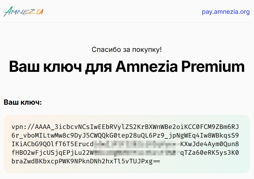 После оплаты Amnezia Premium вы получите письмо с ключом подключения на почту, указанну ю при оплате.