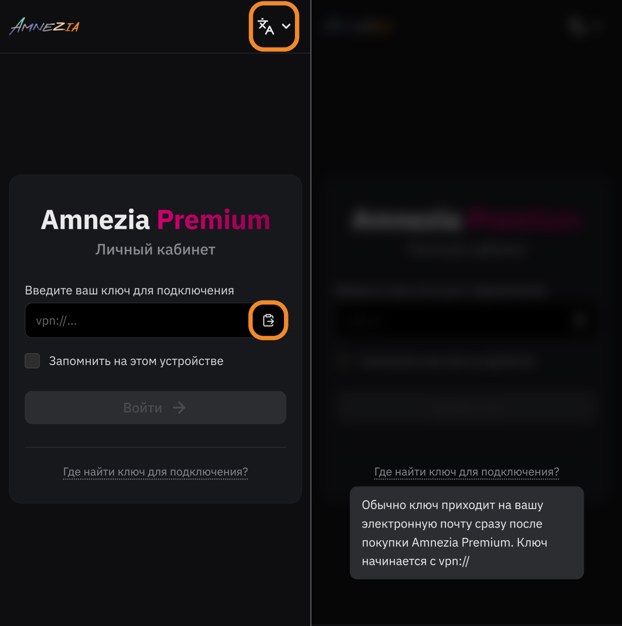 Для входа в личный кабинет используется ключ для подключения vpn://, который вы получаете в письме после оплаты Premium-подписки или запроса её пробного периода.