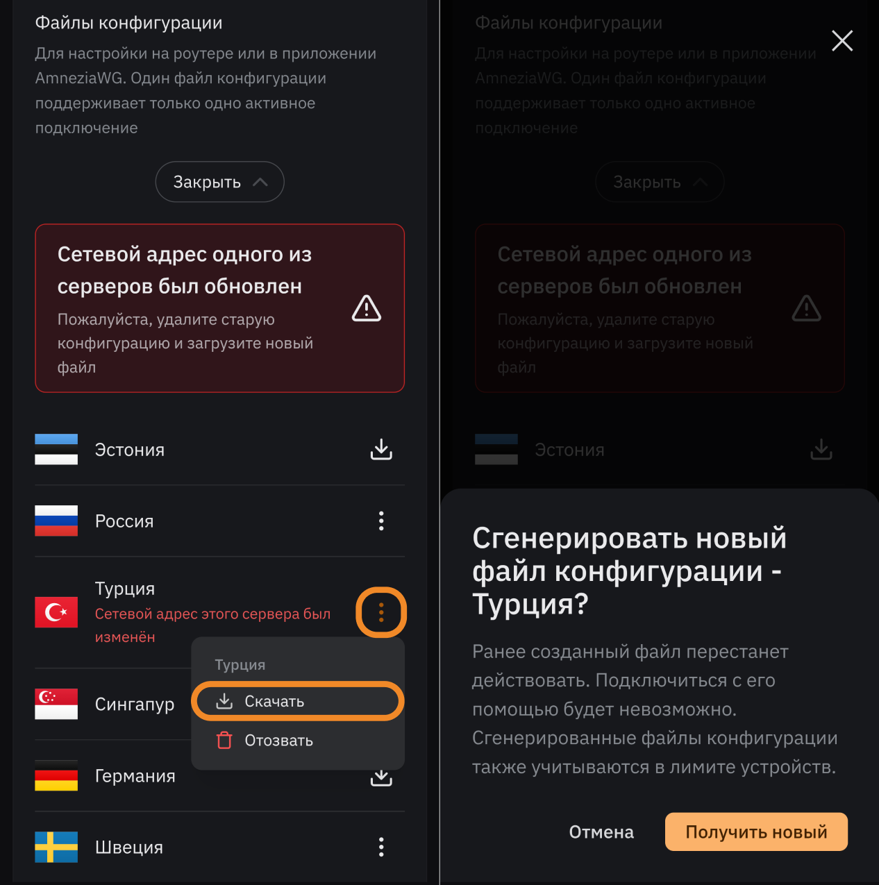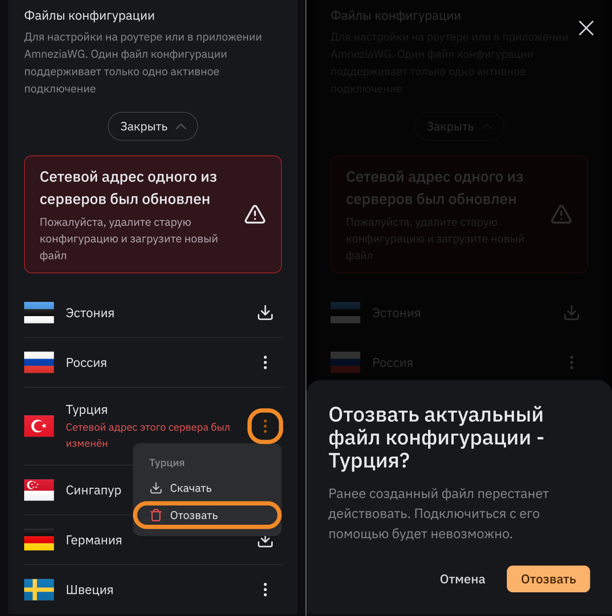 Чтобы перевыпусти ть или отозвать сгенерированный ранее файл конфигурации, нажмите на значок «⋮» (три точки) справа от названия локации. В этих случаях старый файл конфигурации перестанет работать в течение 24 часов.