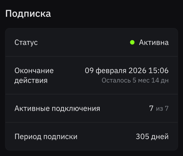 В информации о подписке указан не только её статус, но и точная дата окончания — часовой пояс будет совпадать с поясом на вашем устройстве, на котором открыт личный кабинет.