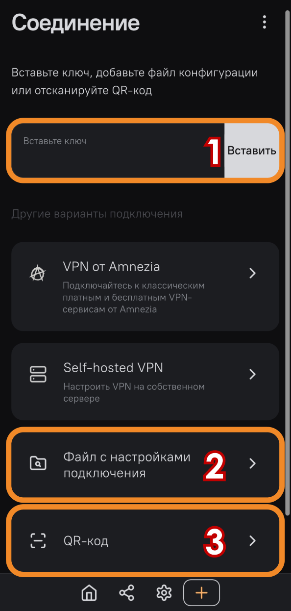 Есть три варианта, как можно поделиться ключом, чтобы использовать его для подключения в приложении AmneziaVPN: