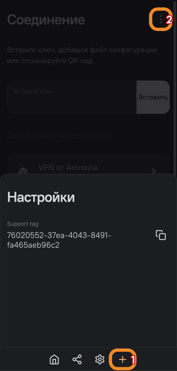 Отличить устройства друг от друга можно не только по названию их операционных систем, но и по уникальному идентификатору, который называется Support tag. Чтобы показать Support tag на устройстве, нажмите ➕ (плюс) на нижней панели приложения AmneziaVPN → «⋮» (три точки) в правом верхнем углу.