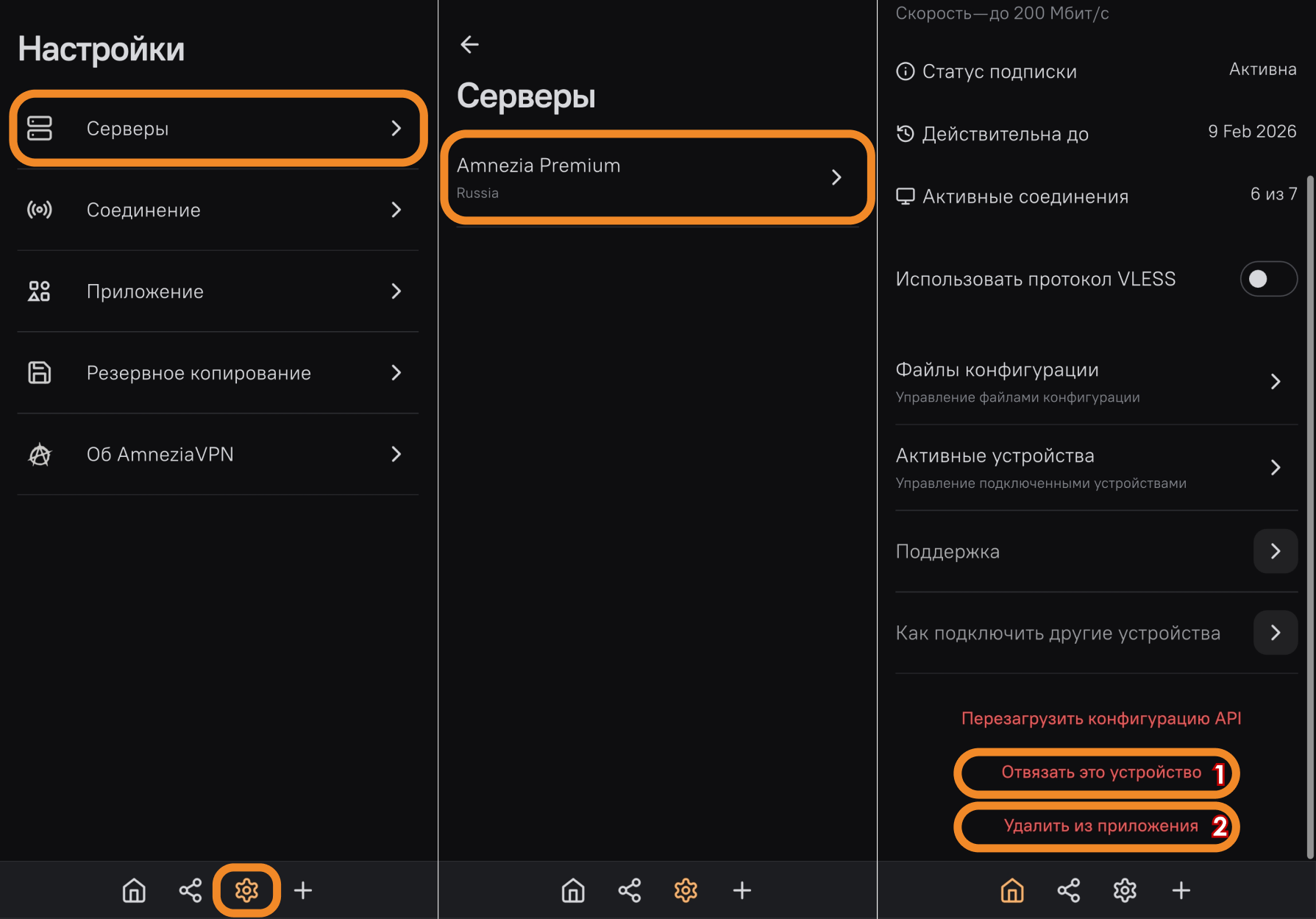 Чтобы безвозвратно отозвать доступ у устройства, зайдите на нём в приложение AmneziaVPN → ⚙️ (шестерёнка) на нижней панели → Серверы → Amnezia Premium → Отвязать это устройство → Удалить из приложения.
