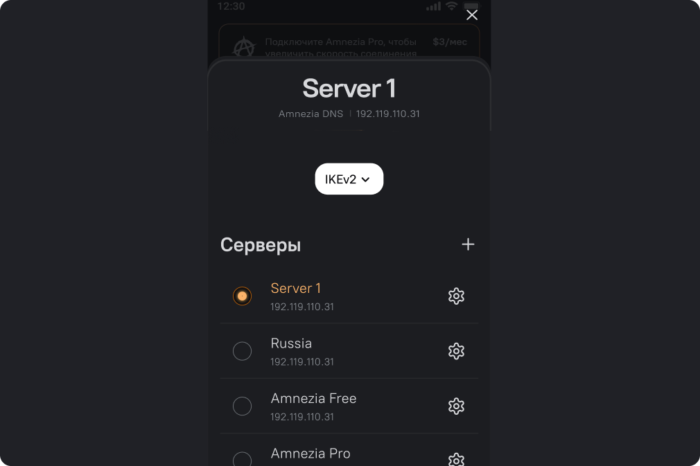Откройте приложение AmneziaVPN. На главном экране внизу кликните на название вашего сервера.