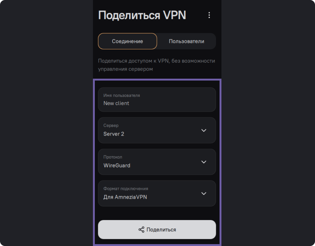 Поделиться подключением — это значит предоставить доступ к своему VPN другому пользователю. Можно предоставить полный доступ с возможностью вносить изменения на сервере, в таком случае, тот, с кем вы поделились, сможет устанавливать, удалять и настраивать протоколы и другие сервисы Amnezia. А можно предоставить доступ только для подключения, в этом случае пользователь, с которым вы поделились, сможет пользоваться вашим VPN, но не сможет менять его настройки и протоколы.