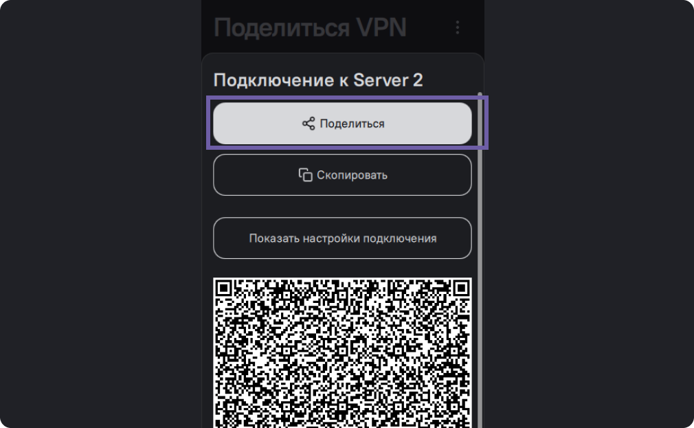 После выбора всех настроек нажмите на кнопку “Поделиться”. Вы можете отсканировать QR-code, скопировать код в буфер обмена и поделиться ключом в виде текста, или сохранить файл с настройками, нажав “Поделиться настройками”.