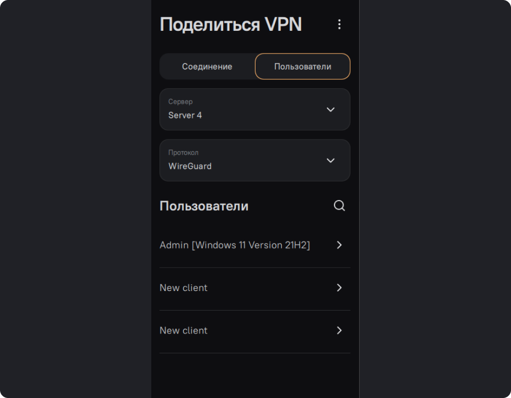 В меню “Пользователи” вы сможете посмотреть, с кем вы делились подключением, а также отозвать доступ к своему VPN.