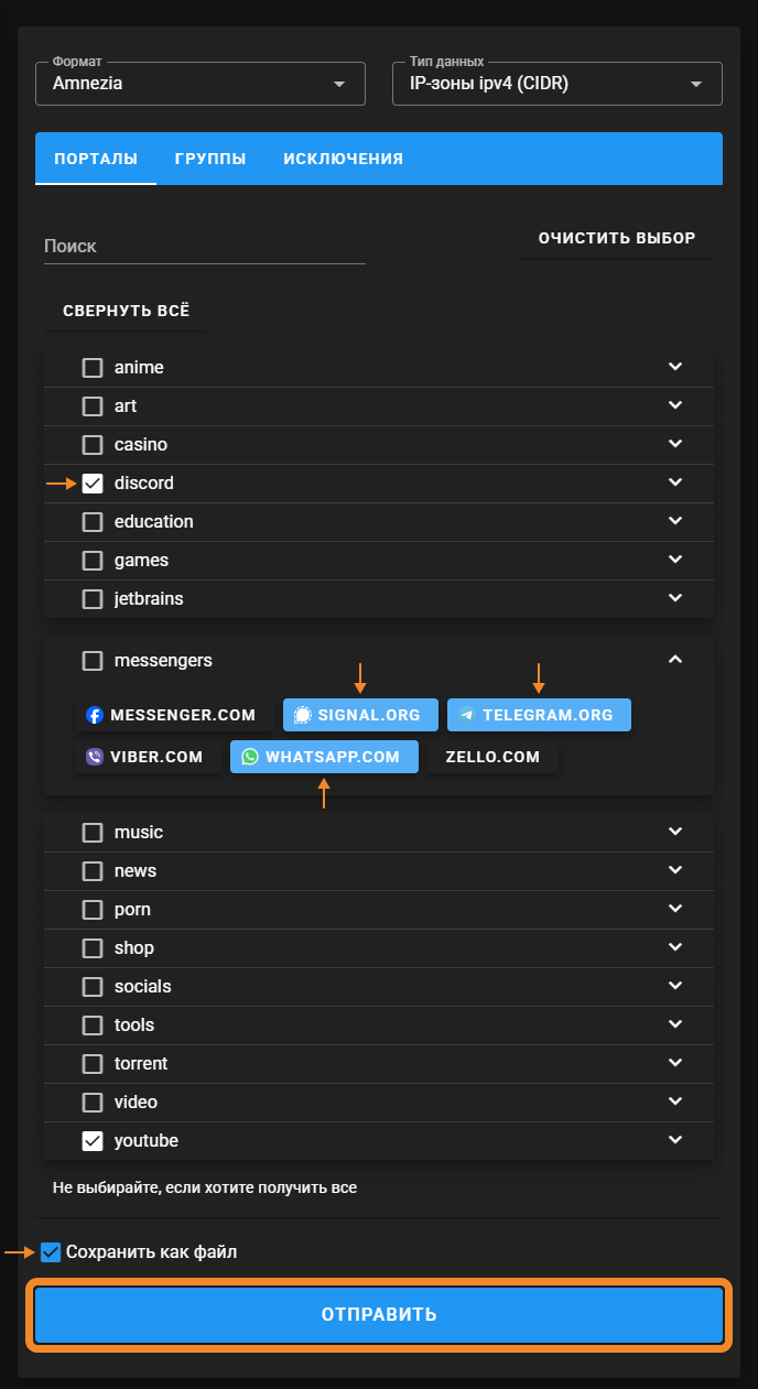 Внизу страницы поставьте галочку Сохранить как файл и нажмите кнопку Отправить — на вашем устройстве сохранится файл ip-list.json.