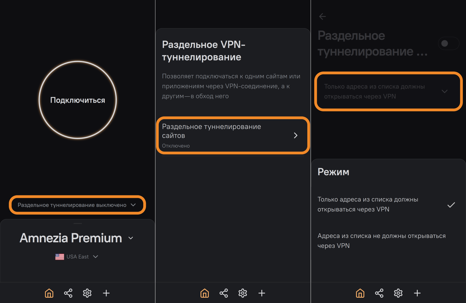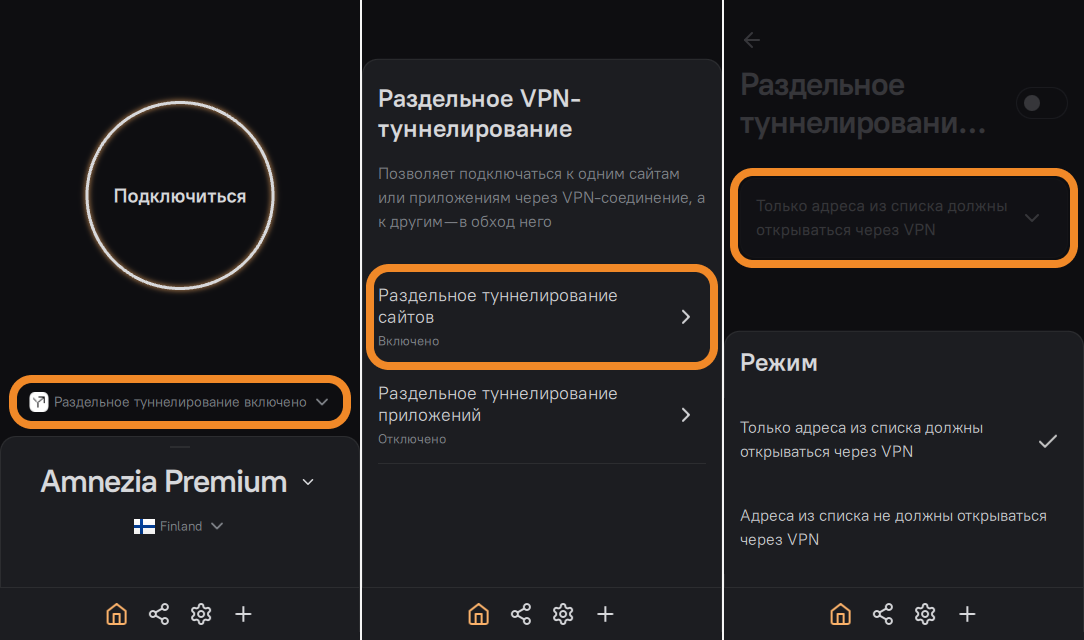 - Зайдите в параметры раздельного туннелирования сайтов в AmneziaVPN и выберите вариант Только адреса из списка должны открываться через VPN.