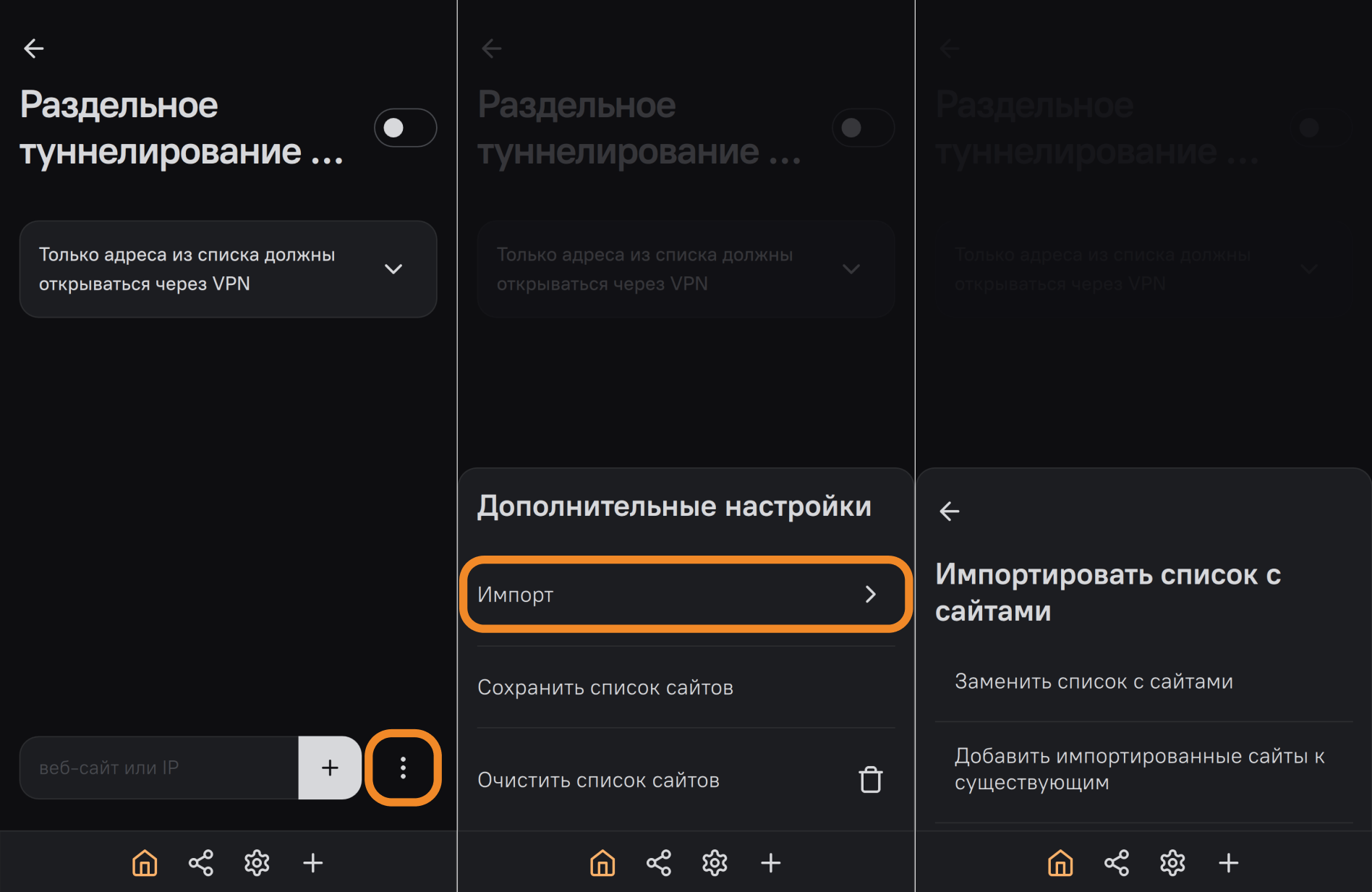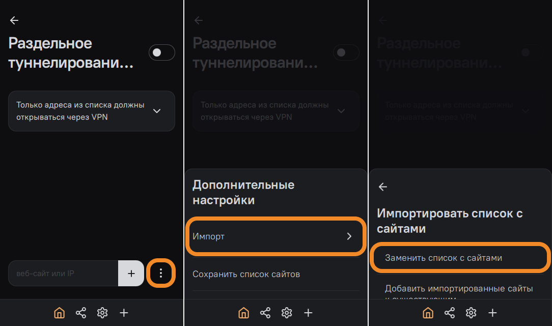 - Нажмите на значок ⋮ (три точки) и выберите предпочтительный способ импорта (Добавить импортированные сайты к существующим или Заменить список с сайтами).