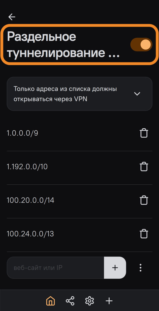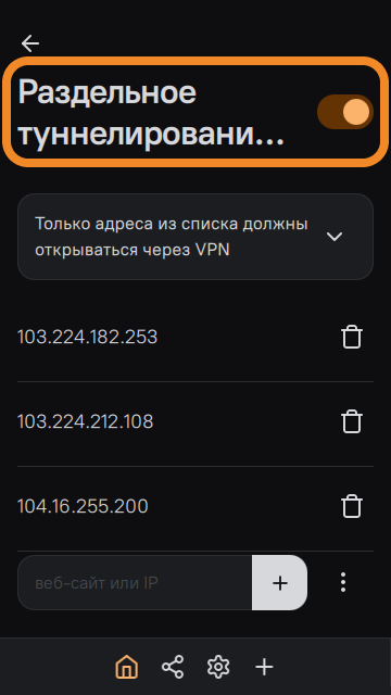 - Android — раздельное туннелирование можно настроить и по IP-адресам, и по приложениям, для каждого варианта доступны два режима: выбранные IP-адреса/приложения будут работать через VPN или без VPN.