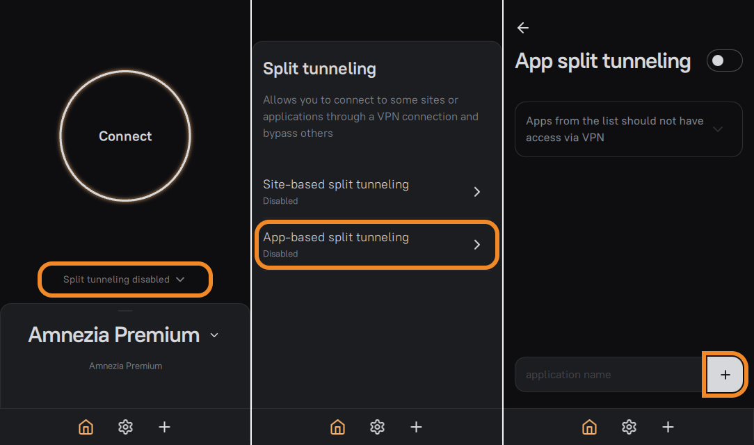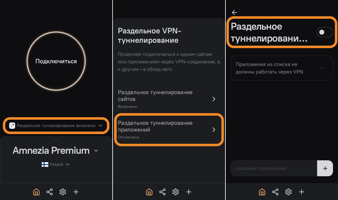 Раздельное туннелирование, или split tunneling — это функция приложения AmneziaVPN, позволяющая выбрать IP-адреса/подсети и приложения, которые будут работать через VPN или без VPN.