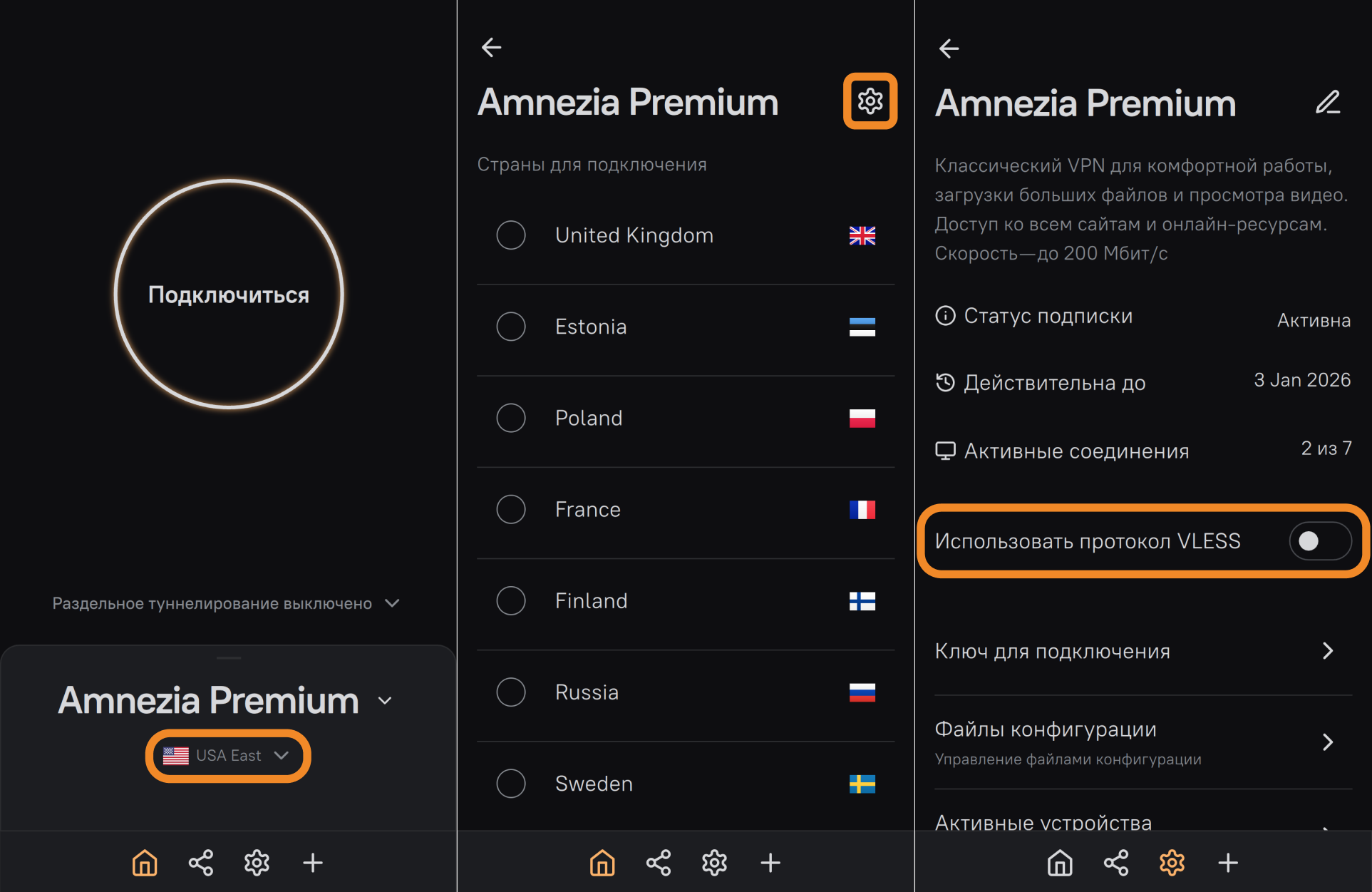 - Переключите опцию Использовать протокол VLESS и попробуйте вновь подключиться к VPN.