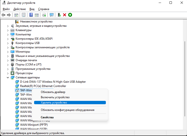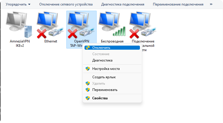 Зайдите в "Сетевые адаптеры" и отключите адаптер TAP Adapter V9 (его создает Amnezia), затем удалите его, если адаптеров несколько, удалите их все.