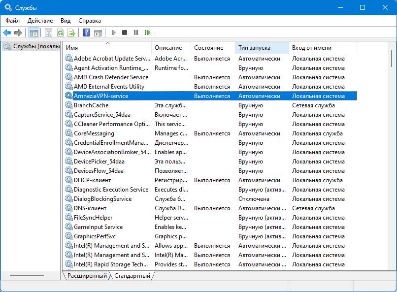 9. Найдите AmneziaVPN-service в списке служб Консоли управления. Обратите внимание на Состояние и Тип запуска. По умолчанию, тип запуска AmneziaVPN-service, Автоматически.