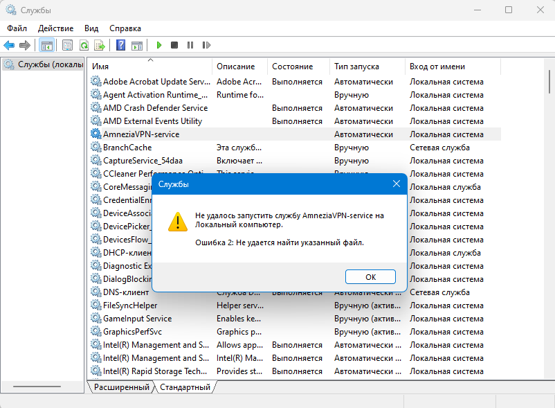 Также, при попытке запуска AmneziaVPN-service из Консоли управления, может выводится сообщение об ошибке, с причиной её возникновения.