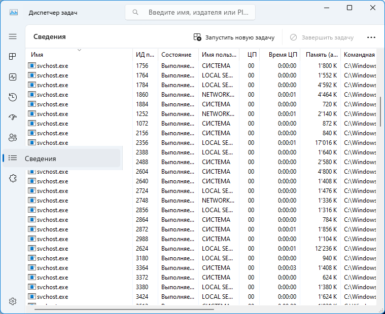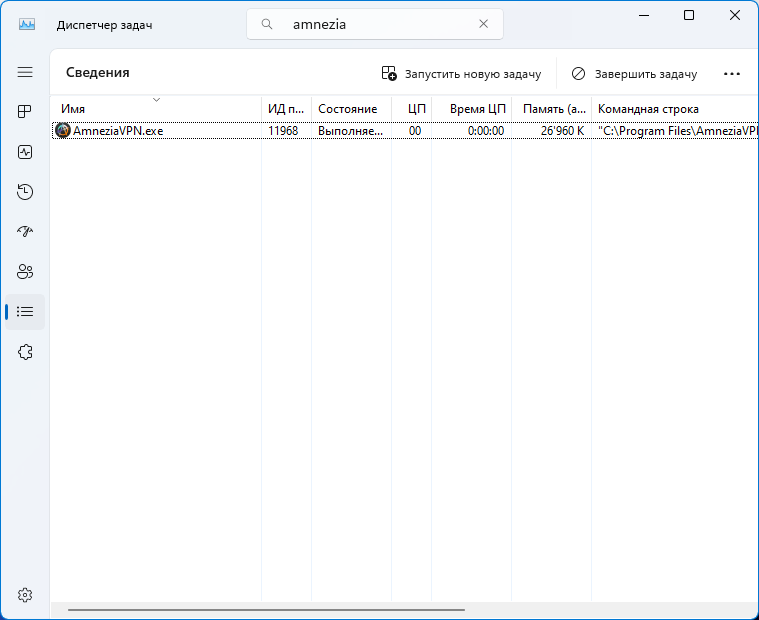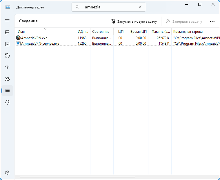 6. Если служба AmneziaVPN-service запущена (Состояние: Выполняется), а во вкладк е Сведения, присутствует процесс AmneziaVPN-service.exe