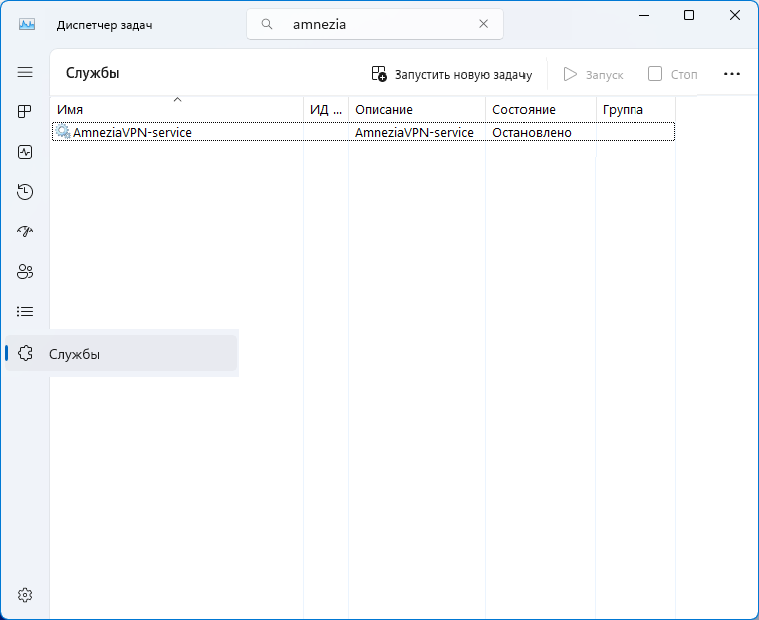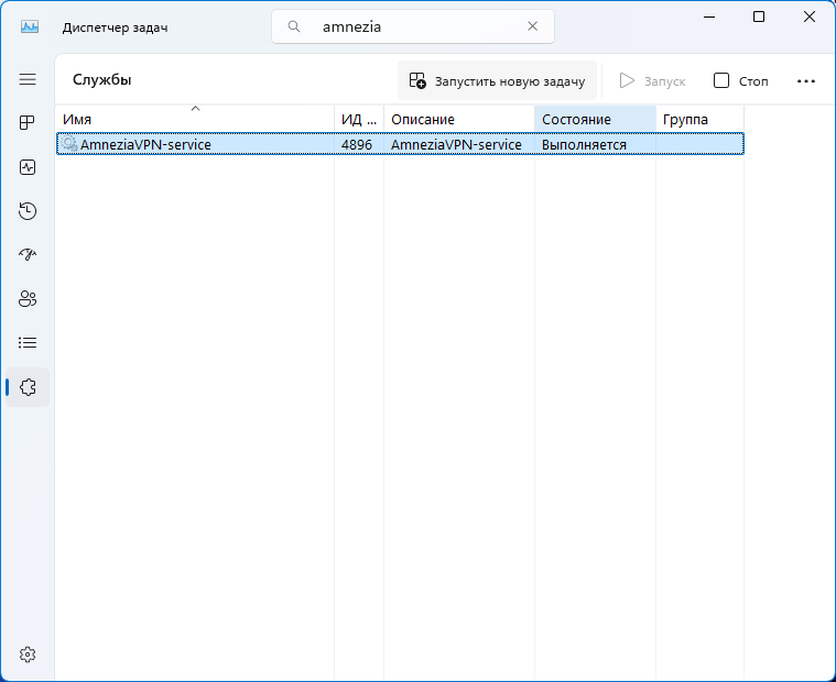 4. Если в списке найденных процессов, отсутствует AmneziaVPN-service, перейдите во вкладку Службы, и обратите внимание на состояние службы AmneziaVPN-service