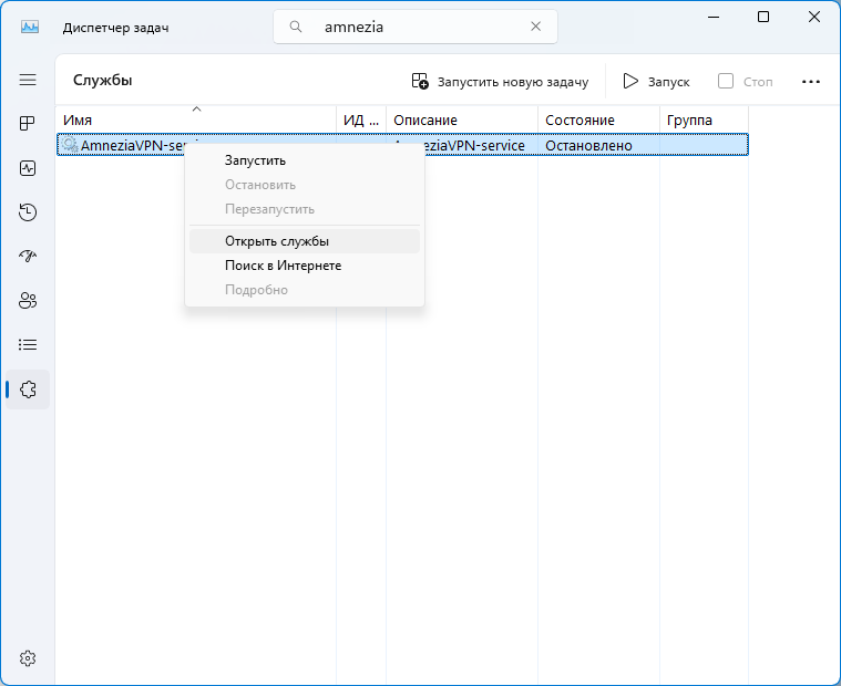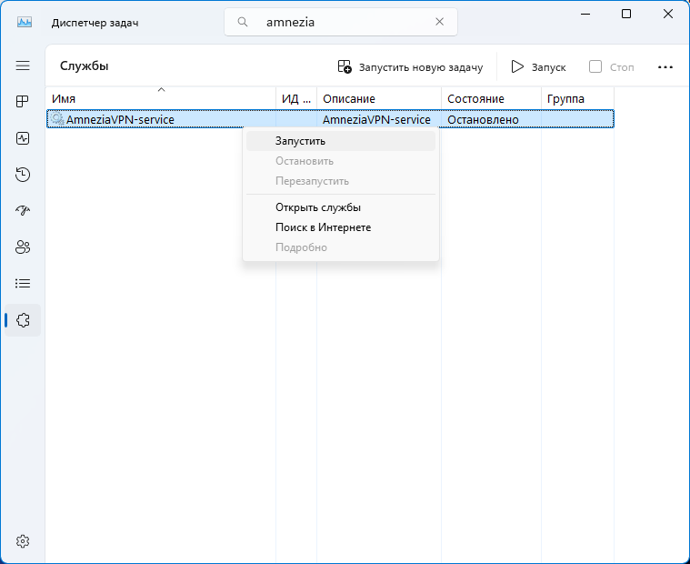 5. Если служба AmneziaVPN-service остановлена, на данном этапе, можно попробовать её запустить