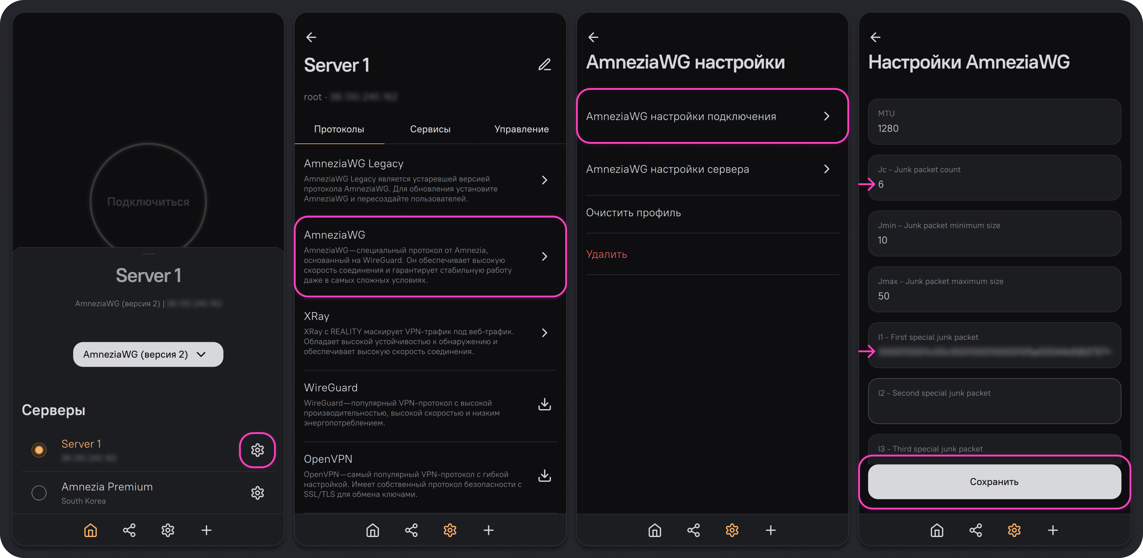 Если VPN-подключение не работает с параметрами протокола, предустановленными приложением AmneziaVPN, попробуйте их поменять: